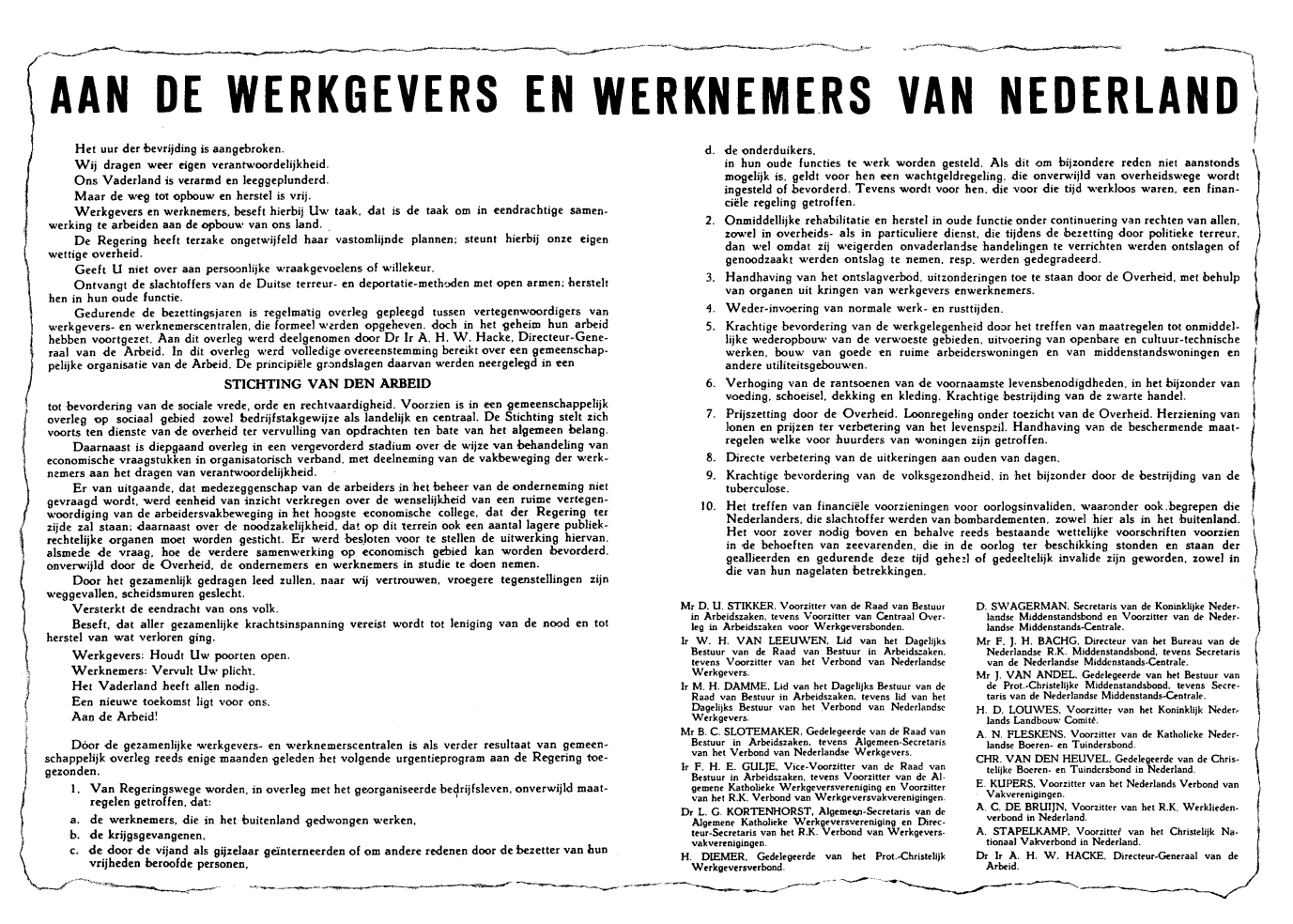 ‘Het uur der bevrijding is aangebroken. Wij dragen weer eigen verantwoordelijkheid. Ons Vaderland is verarmd en leeggeplunderd. Maar de weg tot opbouw en herstel is vrij. Werkgevers en werknemers, beseft hierbij Uw taak, dat is de taak om in eendrachtige samenwerking te arbeiden aan de opbouw van ons land.’